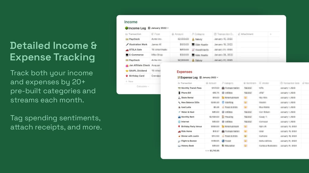 🌳 Income Tracker by Category – track several income streams (salary, investments, side hustles, and more), attach paystubs, invoices, and more
