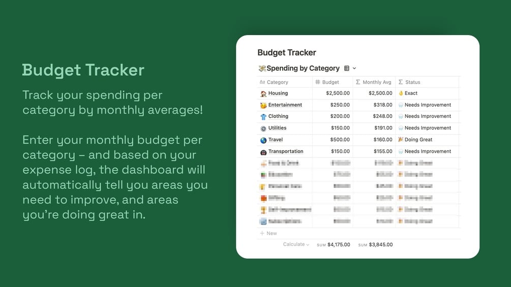 🧾 Budget Status Tracker – set your monthly budget per category and see where you're at by monthly average (automatically pulls from the dashboard expense tracker!)