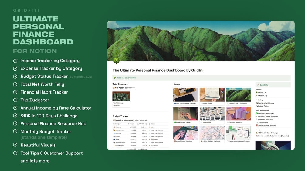 Have everything for your finances in one place with the Ultimate Personal Finance Dashboard for Notion! This all-in-one hub features 10+ pre-built templates and tools to make finances fun, including: