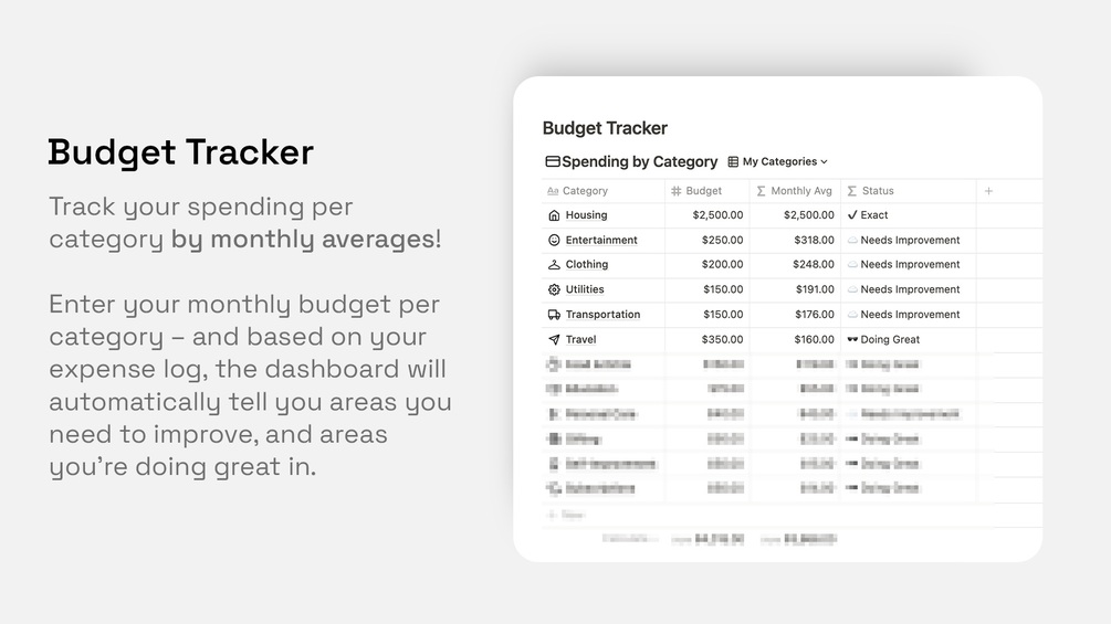 🧾 Budget Status Tracker – set your monthly budget per category and see where you're at by monthly average (automatically pulls from the dashboard expense tracker!)