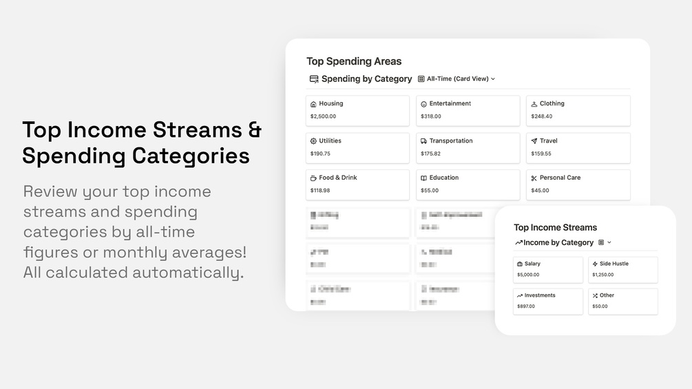 💳 Recap of top income by streams, and top spending by category – by monthly average or all-time stats. See where you're making and spending the most!
