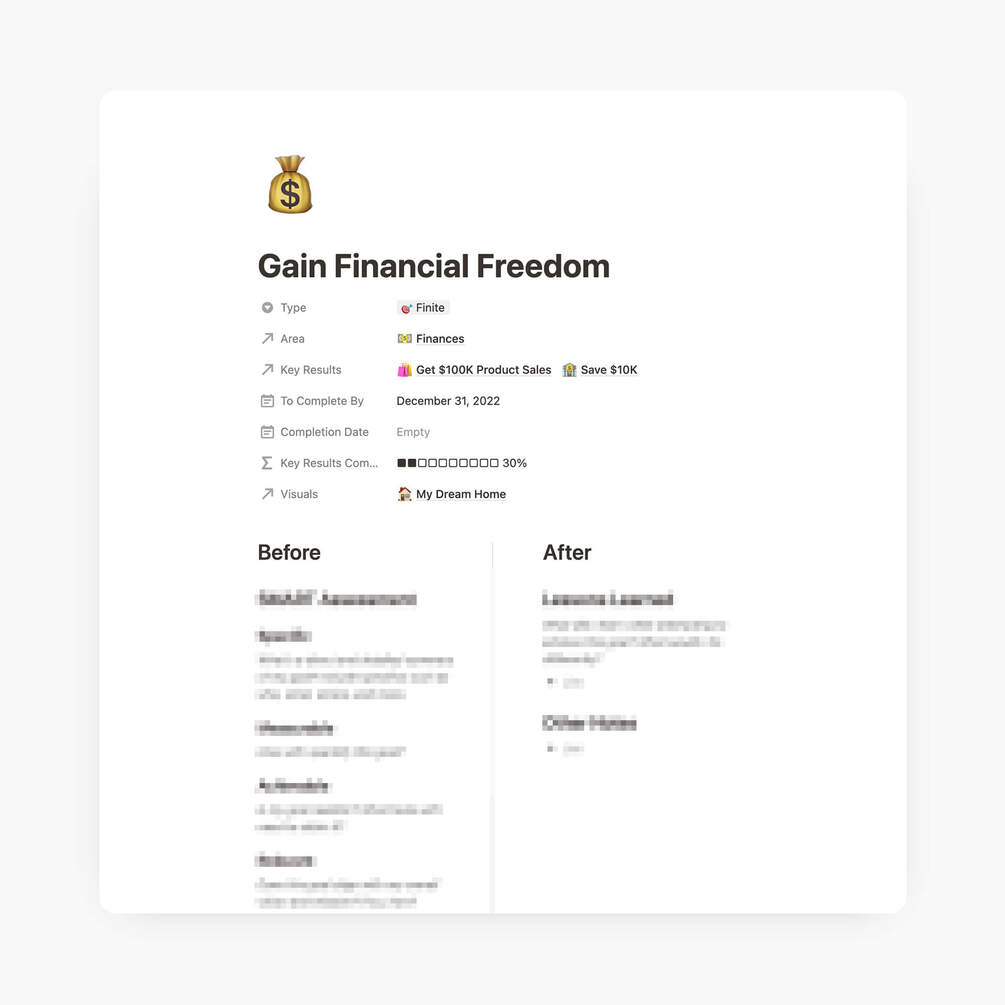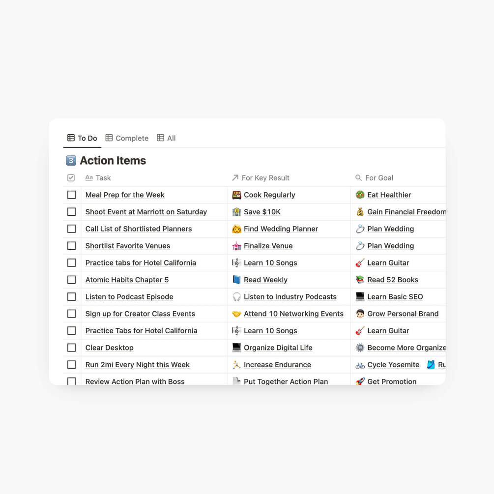 🎯 Set high level goals, by several different areas of life. Using the OKR (objectives and key results) system, there are 3 tiers to dissect your goals into manageable and tangible action items