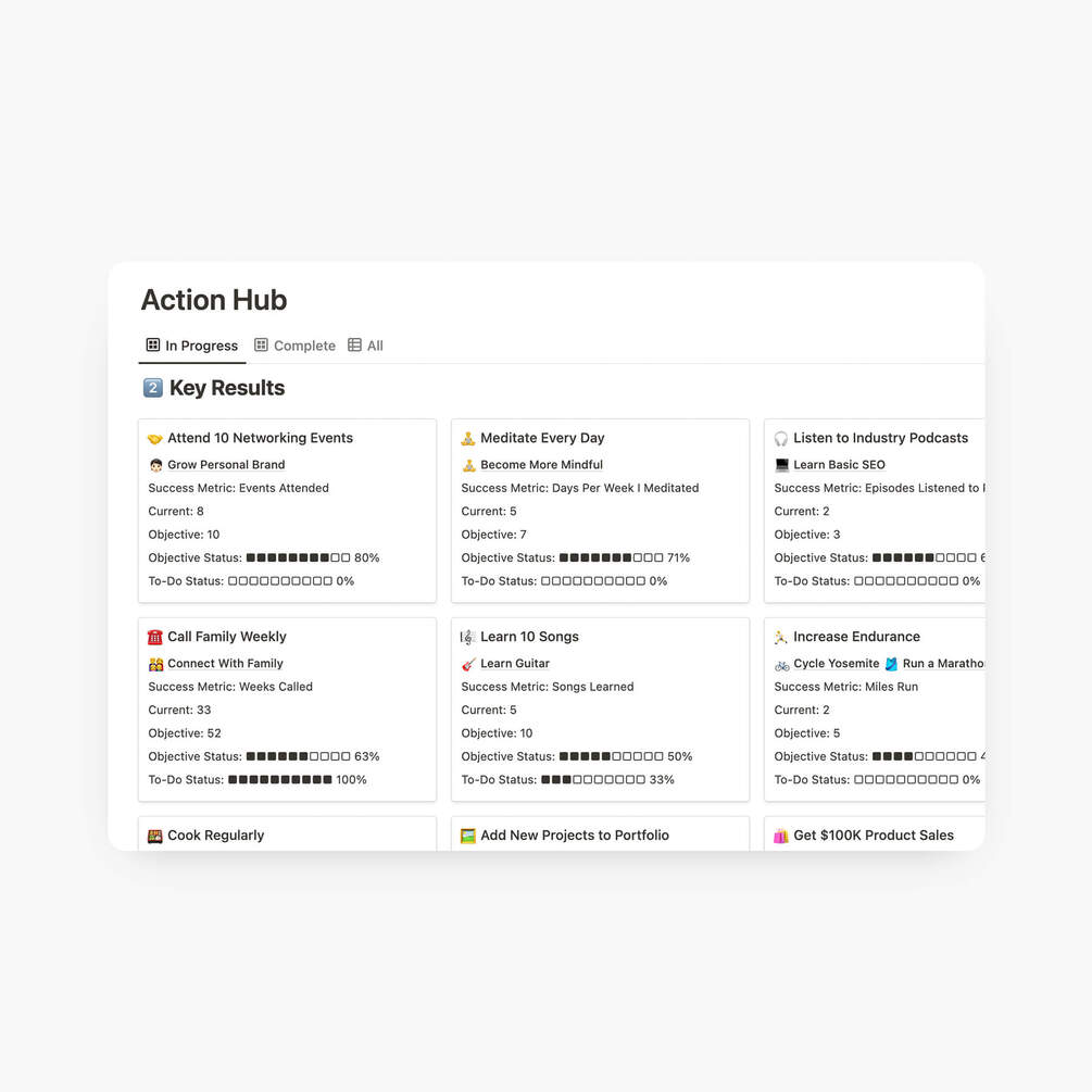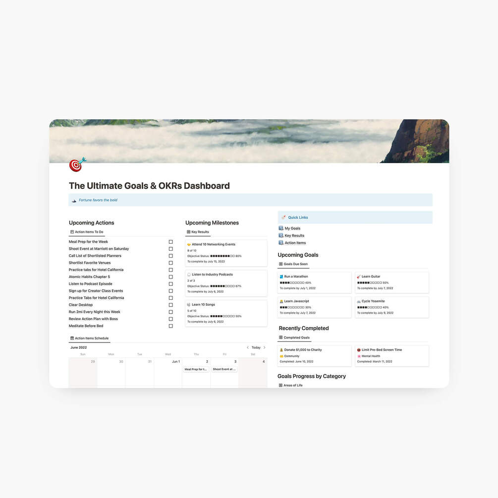 The Ultimate Goals & OKR Dashboard for Notion is designed to help you map out and actually achieve your goals – no matter how big or small – by breaking them up into an actionable system.